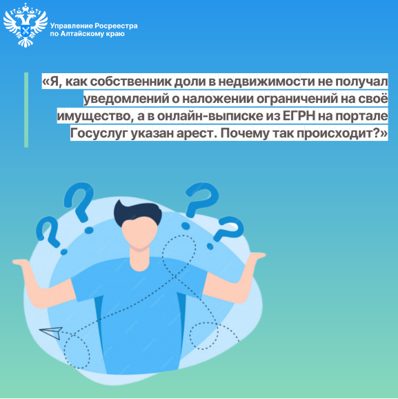 «Я, как собственник доли в недвижимости не получал уведомлений о наложении ограничений на своё имущество, а в онлайн-выписке из ЕГРН на портале Госуслуги указан арест. Почему так происходит?»
